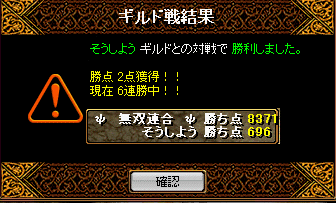 今日は、楽しいことがありました。その前に、昨日の無双のGvから。勝ちました~。なんと6連勝bアチャさんが当分来れないということで、心配してましたが、がっつり連携きまったかな~。酔拳はというと、お相手のTOPのアチャさんを隔離→足止めで、戦場に近づけないようにしよう作戦しました。それもはまったのかな~と自分で思ってます。あとは、火力陣にお任せで、全滅勝ちできました~。いつまで連勝できるかが楽しみですw続いては、本日、G作りました!!やっとこの日がきました。それにちなんで、ブログタイトルも変えようかな~と考え中。これからジロは、このGでまったりといきたいと思っています。楽しみですね~。これからは、お世話になったGと対戦したいな~と思っています。そのときは、よろしく^^ではノシシ
