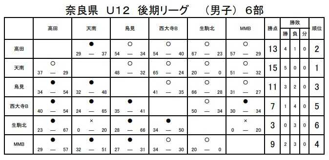 奈良県U12 後期リーグ戦 5部第5部(6チーム)に参戦しました。13名が参加しました。4勝1敗で2位でした×生駒北31-59生駒クラブ(1位○生駒北69-37鎌田(3位○生駒北62-28平城B(4位○生駒北50-29大和(5位○生駒北56-36富雄北(6位