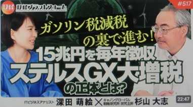 昨日の「政経プラットフォーム」の続き。その規模が、腰抜かすぐらいでかいんですよ。再エネ賦課金が年間3兆円もある…「これをやめろ」と言いたい。政府が進めてる「GX計画」は、10年間で150兆円!深田:太陽光パネルがまた増えたら、 再エネ賦課金も それに伴いさらに増える…たちが悪いのは、これ形で出てくる。再エネ賦課金みたいになるのもあるし、それがあちこちで規制したり、あちこちで賦課金、あちこちで税金かけてやってて、政府風に言うと、「規制と支援で、GX投資を促す」深田:アメリカ人によると、 「トランスフォーメーション」は、この15兆円のために、今着々と法律制度を深田:環境省?経産省が作っています。これ昔環境省が言ってたことなんですよ。経産省はずっと抵抗勢力だったけど、菅さんが来て「グリーンだ!」と言ったら、もうみんな「ハハ~」と(ひれふし)、みんなグリーンになっちゃった! 環境省の人は仕事なくなって、「ボ~」としてますけどね。深田:役所的には「よくやった」ということなんですけどね。