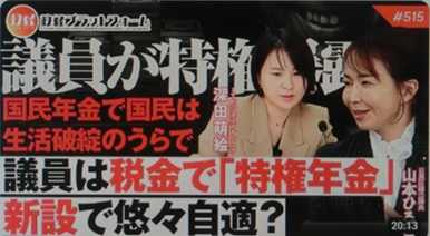 昨日の「政経プラットフォーム」の続き。とにかく「議員ファースト」「国民年金が安い」というこの制度を進めようとしてるんです。署名が集まったので、全国市議会にアポを取ると、国会議員の先生方とはアポは取るけど、私が一生懸命集めたこれって本当に矛盾してると思うんですよね。本当に報道されないので…深田:ほとんど知らないですよね。 私も山本さんの話を聞くまでは、 『議員厚生年金』のことは、 知りませんでしたからね。 多くの人が知ったら、 「おや?」と思いますよね。なんで議員の人たちは、厚生年金に入れる仕組みで解消しようとするのかとか、色んなおかしな論点がある…深田:やっぱり課題があると思うんですよね。「それが議員の身分が 不安定になる要因だ」と言うなら、なんで自分達が先なんですか?なんで我先にと、自分たちのための制度を…正直「お手盛り」だと思うんですけど自分たちで作ろうみたいな、そういうことをするからホントにこういうことをするから、「議員はロクなことをしてない」とのイメージがつくんだと思うんですよ。深田:ロクな事してないですよね。 こうやって(ちゃんと)お仕事してると、 議会から追い出されるかもしれませんね。