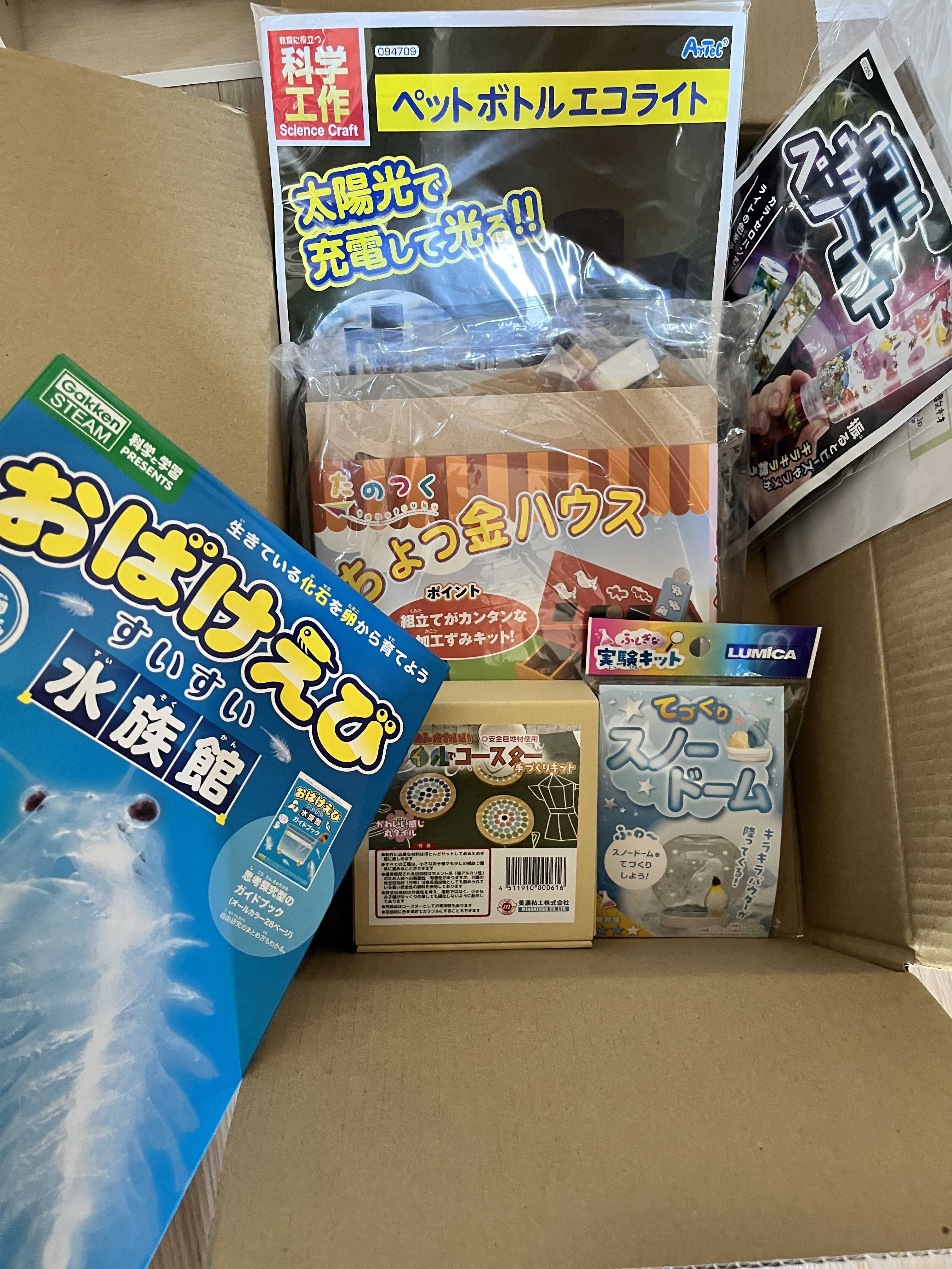 マラソン前に購入していた夏休みの準備品です。いかんせん時間がありすぎるw熱中症警戒アラートが出たらプールや外遊びもできないので、室内でできる、且つ夏休みの課題にもなりそうな工作キットをいくつも購入しました。 真ん中3点は楽天で購入したもの↓貯金箱 工作キット ちょっ金ハウス 夏休み 男の子 女の子 小学生 低学年 高学年 子供 幼児 大人工作キット ペットボトルエコライト 夏休み 男の子 女の子 小学生 低学年 高学年 子供 幼児 大人工作キット モザイクタイルでコースター手づくりキット 2枚分 夏休み 男の子 女の子 小学生 低学年 高学年 子供 幼児 大人向けこちら3点はトーヨー教材さんで購入。去年はごまかしましたが、今年も欲しいと言われたので、さすがに買いました…これで観察日記をやる予定です。おばけえびすいすい水族館 (科学と学習PRESENTS) [ 学研プラス ]あとは早速昨日開けてしまって写真にない↓も買いました。ぬれない砂と水玉くん 摩訶不思議な砂で実験やゲームを楽しもう! (科学と学習PRESENTS) [ 科学編集部 ]残りは100均で購入。※100円ではありませんでした。これらとは別にチャレンジの実験キットも届いて、キット祭りです^^;