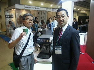 昨日のSCAJ展示会で一杯ドリップも出来る最新のコーヒーマシンを紹介頂きました。 FBフレンズでもあるブルーマチックジャパン(株)の河口社長と一緒に。コーヒーを一杯一杯丁寧に淹れるハンドドリップ、そのコンセプトを機械で出来ないかと開発されたのがこのマシンです。品名”G4カーティス ゴールドカップ ブルワー”、社長自らセットして一杯ドリップを試飲させて頂きました。貴方の為に淹れたコーヒー、おもてなしの心が詰まった一杯は美味かった。 バックNo.313:珈琲場面オンとオフ(↓スクロールしてネ) ■サニーフーヅオンラインショッピング■●コーヒー豆 ●サワー濃縮果汁 ●フルーツ&フレーバーシロップ 人気blogランキングに参加中応援いつも感謝です^^♪