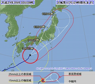 非常に強い台風とランク付けされた17号は、30日午前、四国の南海上を北東へ進んでいる。 気象庁によると、同日夕にも強い勢力のまま東海から関東に上陸予想、厳重な警戒を呼びかけている。詳しい情報はこちら私は出掛ける予定はないが、外出している方は夕方までに帰宅した方がよさそうです。家の鉢植えなど室内に避難しました。今現在は、風もなく穏やかで嵐の前の静けさですが、皆さんどうぞ厳重な警戒を ■サニーフーヅオンラインショッピング■●コーヒー豆 ●サワー濃縮果汁 ●フルーツ&フレーバーシロップ 人気blogランキングに参加中応援いつも感謝です^^♪