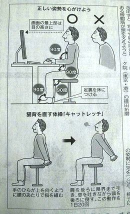 毎日の生活の中で、気をつけていることがある。それは背筋を伸ばすこと。「背中がパンパンに張っている、猫背を治しましょう」、とマッサージに行くといつも言われる。 今朝の日経新聞で『意外な万病のもと、侮れない猫背』、という記事を目にした。 一年前の2月、筋肉の偏りの疲労が原因で、完治に一ヶ月かかった腰痛を引き起こした。生活習慣から来る猫背、楽だからは禁物、意識して正しい姿勢を保たなければならない。このイラストをマイデスクに張り付けておきます。猫背を続けると脳が「これが自然だ」と誤認するというから恐ろしい。 ■サニーフーヅオンラインショッピング■ ●コーヒー豆 ●サワー濃縮果汁 ●フルーツ&フレーバーシロップ 人気blogランキングに参加中応援いつも感謝です^^♪