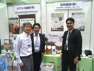 慌しく午前中二つの会議を終らせ、昨日は東京ビッグサイトへ行ってきました。このブログでも紹介した最終日の”カフェ・喫茶ショ―”です。 展示会では、お取引先や業界仲間に久しぶりに会えるのも楽しみの一つ。 神戸本社の日米珈琲さんのブースで北浦社長、出張で来られ同行した稲垣社長と一緒に! コーヒー・ドリンク関連の興味ある商品やマシンの情報収集が出来て有意義な時間を過ごしました。 バックNo.248:素敵なお付合い仲間(↓スクロールしてネ) ■サニーフーヅオンラインショッピング■ ●コーヒー豆 ●サワー濃縮果汁 ●フルーツ&フレーバーシロップ 人気blogランキングに参加中応援いつも感謝です^^♪