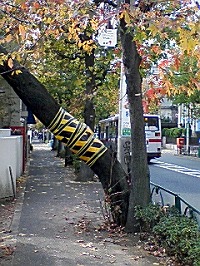 舗道をご覧のように目の高さで塞いでいます。幹はしっかりしているので倒れないけど、しかしよそ見してたり目の不自由な人には危ない。 左側は駐車場なので建物はなく問題はありません。