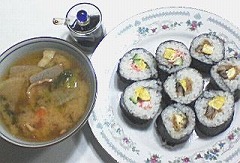 アナゴ、干ぴょう、きゅうり、タマゴ焼き、・・そして豚汁の組み合わせが私のお気に入りです。他にもちらし寿司とか酢飯の時には、豚汁がピッタリ合いますね。
