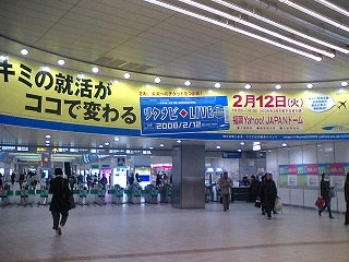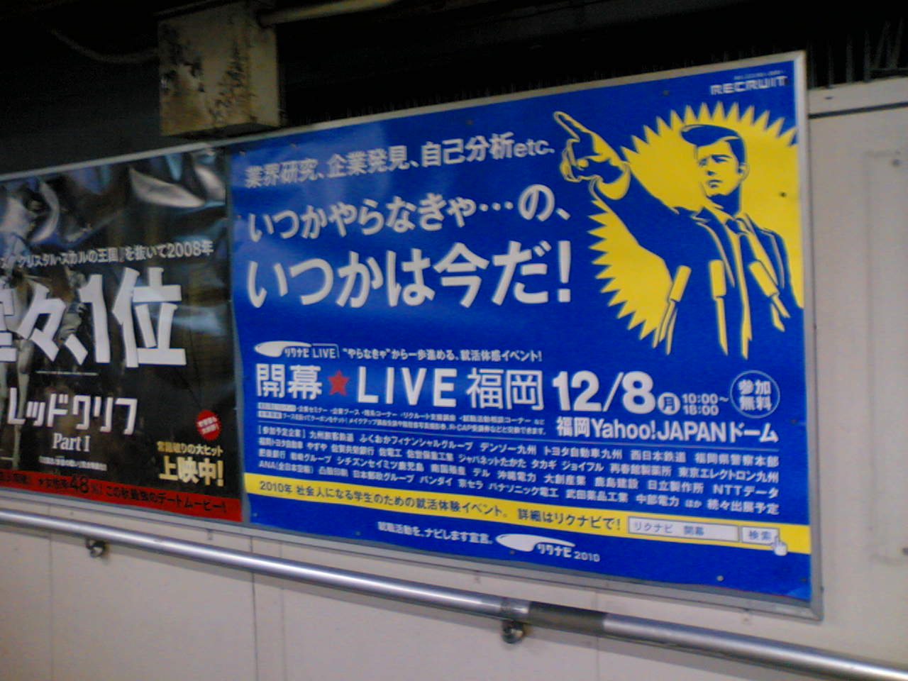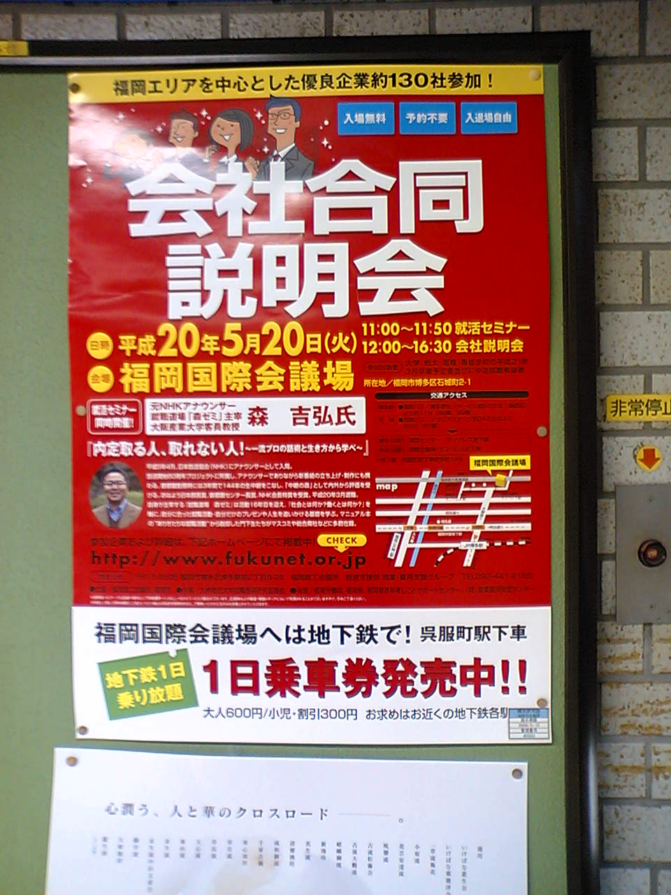 先月は大きな就職説明会、というかほとんどイベント大会がいくつもありました。それにしても、派手は宣伝広告でしたね。その中でも、これ↓は西鉄福岡駅のやつですが、ものすごい目立ち方。(というか目立たないという要素がない。笑)これでそうとうな集客?があることはわかりますが、いったい広告料ってどのくらいなのか、とつい考えてしまいますね。はたして採算はとれるのか、と。まあ、イベントへの学生の入場料は無料でしょうが、お金の出所はスポンサーである多くの企業からなわけですから、そうなると、その企業に勤めている社員や、これから勤めようとする人や、商品コストとの関係まで目をむければ、その消費者とも関係してくるわけですし。 消費者 → 企業 → イベント会社でも、たぶん、就職業界のお金の流れは、そんなに単純じゃないんだろうな。(別に追及する気はありません。笑)