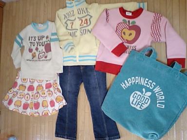 またまた福袋購入。☆F.OOKIDS☆の女の子用100です☆子は2歳3ヶ月、88cm、12.4kgです。ご参考までに。左から、少し細身のTシャツ、ダブルガーゼっぽいティアードsk、厚めのジャケットにジーンズ(88cmの子は長すぎたので少し裾を折ってはかせます。)、トレーナーもしっかりとしていて(子は硬い!といっていたが・・・)キャンパス地バッグに5着はいっていました。グリーン好きの私としては、かなりバッグが気に入りました。あと男の子用のブルゾンとTシャツもかなりかわいかったので購入もかんがえましたが、パンツがイマイチだったので断念しました。ここのブランドには思い入れがあって、妊婦中の検診で女の子と判明した日に、初めて買った服がここのワンピ。かなり好きでしょっちゅう購入してます。福袋はパパが店員さんにお取り置きをお願いしてあったようで、「ありますよー、95かまよったけど、100にしておきました。」ってよくわかってらっしゃるわ