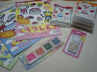 どうも最近熱中してしまってPCにむかうお時間が少ないようで・・・。先日教えていただいたセリアに早速いってきました。100均ひさしぶりー♪とかなり長い時間眺めてました。これがお買い物品。トーカイで買っていたから高いなーと貧乏買いしてました。今回は大人買い?です。で、つくったのがこちら。左端のは、パパのオリジナル(ナポレオンバード)だそうです。よくわからないけど、誰かに似てる?あとは本にのっていた、作りたかったはんこその2.です。これは、パパが昔知り合いの洋食屋さんに提供した豚。その後看板になりました。で、こんなふうにぽんぽんしてみます。このリネン目が粗すぎ!!私はこのブタが気に入ったので、これでパパの薬ポーチを作りました。パパは絵が大好きで美大に行きたかったけど貧乏で断念。だそうです。でも、どちらかというと漫画をかきたかったらしい・・・。このほかにもかなーりへんてこなキャラをかいては、「これどう?あっ、ここほっちゃったの?黒いほうがかわいいのに・・・」もぅ!あんたほれば??そうそう、私、カッターで手をサックリいきまして、相変わらず牛刀です。包丁片手に真剣に毎晩地道な作業しています。これですこしは上達してくれるといいんですけどね・・・。