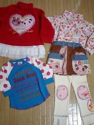 きましたー。みなさんのレヴューみて購入。賛否両論のこちらの福袋、うわさのモンチッチが何故だかたまらなくほしくってちゅうもんしたのにぃー。いなかった。いたのはサルでなくブタ・・・。こちらが全体画像です。全部で6着。見た瞬間、秋??な感じでした。では詳しく・・・。まぁきにいったラフチーのロンT。でもわが子色白だから似合わないんだよね・・・4900エンなり子にヒットしたvanavanaのTシャツ4600エンなり子がすごーく嫌がった、コムコムパワーのトレーナー。うわさのコムコム。なに!ピッグガールって!!うちのこそのまんまじゃんこれが6900エン!?だれもほしくないだろうけど、だれかこうかんしてもいいよーっていうとっても貴重な方、いないですよね・・・。SPANNERのワンピ。100でしょ?長いよーこれ、いつ着るの??というこちらは3900エンなりーで、UNICAの巻きスカート。こういうのすきなんだけど、だから長いんだって!!これでS(95から100)?一緒してたお友達、「それってロングなんじゃ???」そんなかんじで5700エンなり。これはラフチーのリバーシブルスカートだそうだ。すそにはチロリアンテープで意外とかわいいぞ。こちらが裏側のパッチワーク風です。4900エンなり。トップスはトレーナー2枚、Tシャツ1枚、ボトムスはワンピ1枚、スカート2枚の計6枚でした。合計30900円。そしてなぜか届いた商品のサイズ表示の紙には(女の子100 30,900)の文字・・・。なにこれ??ほかの人みたいに女の子チックなかわいいピンクとか本当ほしかったよー。あぁことしの福袋、地元で購入のがいちばんよかったよー。着れるのといったらTシャツに緑のロンTぐらいじゃない??交換・・・してくれないよねーグスン