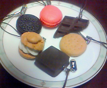 コンプリートしちゃった かなり良く出来ていて、美味しそう♪こうしてお皿にのせてると、小さい子だったら口に入れてしまいそう。携帯ストラップとして使うつもりは無いんだけど、金具外してパーツとして何か作るのに使おうかな。とりあえずバッグチャームが欲しいから、考えてみよっと♪