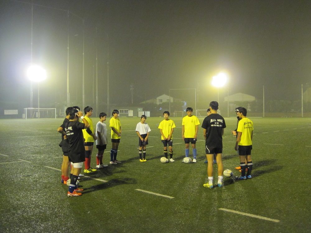 9月21日チームみえジュニアU-15 ナイター練習雨。そこそこの雨。が、下は人工芝。体力もついてきた中学生。雨なんて関係ありません。四日市桑名から1時間かけて。志摩から2時間かけて。鈴鹿、津、亀山から。たった1時間30分の練習の為に。かけがえのない1時間30分の練習の為に。チームみえジュニアU-15の仲間たちが集まってきます。部活が終わってから来る1年生や2年生。受験を控えるなか来る3年生。市を跨いで駆けつけるコーチ。チームの為に仲間の為に。すぐそこにある未来に向けて本気で取り組む。6月のひとつの負けから、そんな気概を感じさせるチームになってきました。