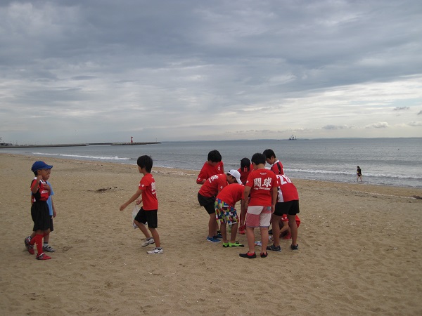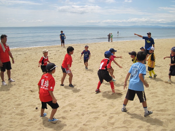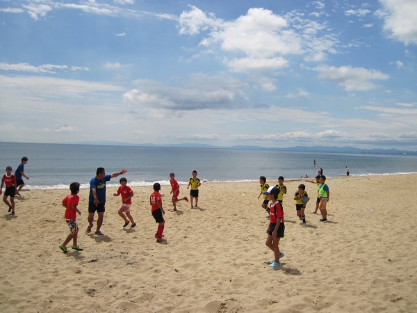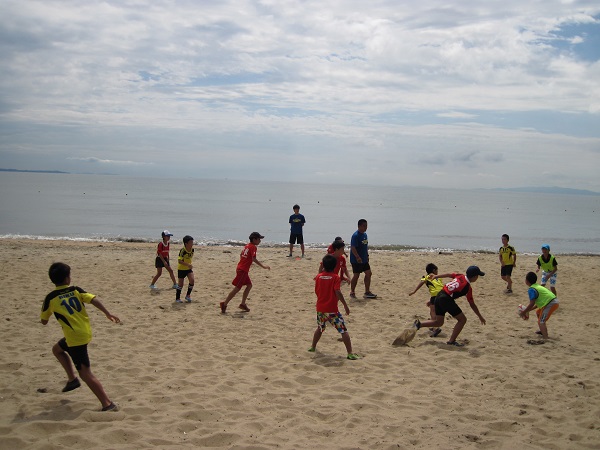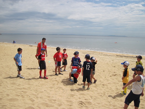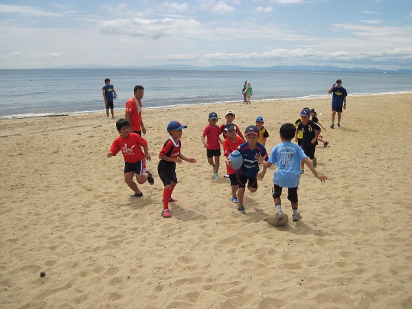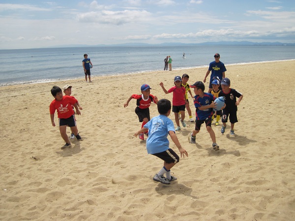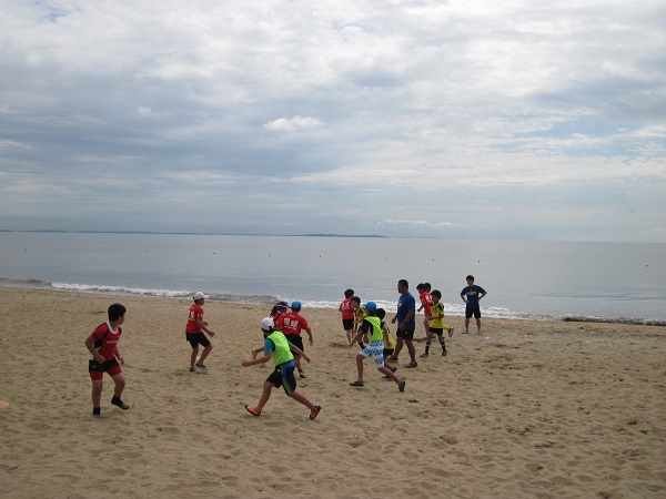 普段のラグビーとは違い、前に投げるパスが一回だけ可能なビーチラグビー。