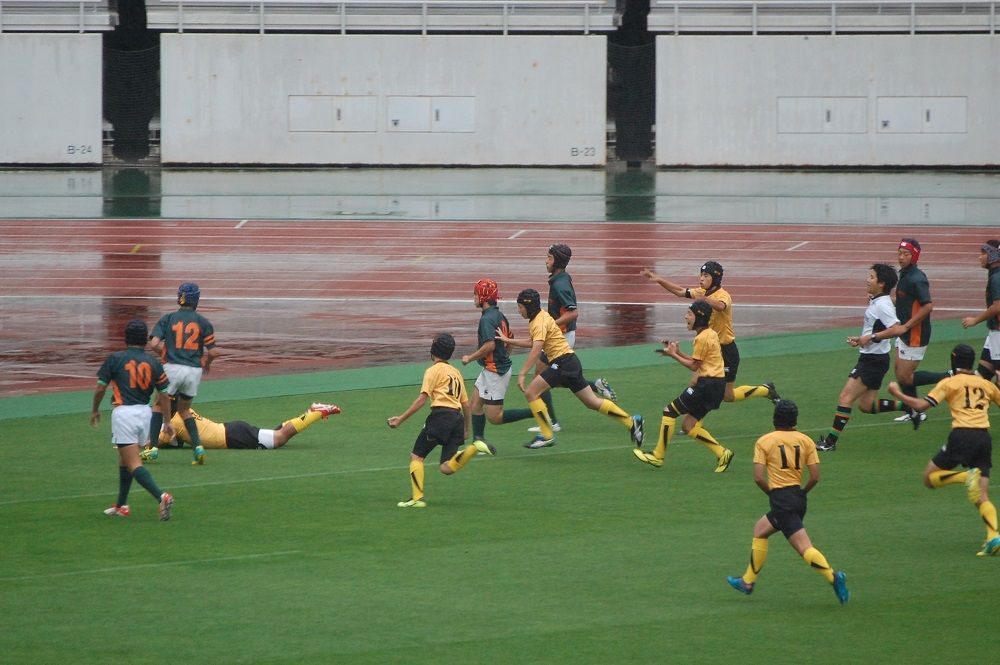 キックオフ直後、約束通りのPからGOで、KjY(鈴鹿RS)の電光石火のトライで先制。