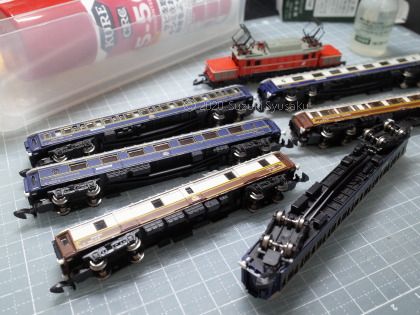 実を言えば若い頃、「オリエント急行」に心酔して少しばかり研究していた時期がありました。その憧憬が後々の「北斗星」での北海道通いに繋がったのだとすれば、今に至る私のルーツの一端は「オリエント急行」だった……とも言えるかも知れません。分解整備して生き返らせた電気機関車に続いて、メルクリン・Zゲージの「オリエント急行」の客車たちも軽く整備しておきました。と言っても、とりあえずは全部の台車の軸受にオイルを注した程度ですが、これでしばらく馴染ませれば、多少は調子も良くなりそうな気がします。裏返せば「Made in W.Germany」の刻印が残る30年以上前の古い製品ですが、いろいろな意味で想い入れのある客車たちなので、生涯、宝物として大切にしていこうと思っています。----おしらせ----【ポストカード】新作4絵柄「クラフトスタジオ」で通販承ります>>詳細はこちら【絵本】福音館書店「かがくのとも」2020年2月号「でんしゃをはこぶ」>>詳細はこちら【札幌の水彩色鉛筆画家】 ~イラストレーター鈴木周作~https://suzuki-syusaku.com