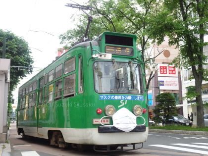 マスクの着用をお願いします……と言葉で言われるよりも、この電車の顔を見れば一目瞭然。発案された方のセンスに脱帽です。確かに札幌の古いタイプの電車って、どことなく人の顔みたいな可愛らしさがありますよね。----おしらせ----【作品掲載】季刊「スロウ」Vol.63/2020春号>>詳細はこちら【ポストカード】新作4絵柄「クラフトスタジオ」で通販承ります>>詳細はこちら【絵本】福音館書店「かがくのとも」2020年2月号「でんしゃをはこぶ」>>詳細はこちら【札幌の水彩色鉛筆画家】 ~イラストレーター鈴木周作~https://suzuki-syusaku.com