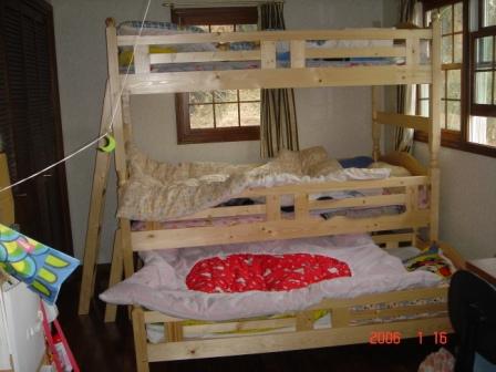 ママが念願の3段ベッド来・ま・し・たぁー^∇^子供部屋を作って子供だけで川の字に寝ていました別に問題はありませんでした。・・・そうママがお布団を毎日たたむのが大変だったのです・・でも3段となるとお値段やら場所やら悩みましたが、決めちゃいましたっ!!・・で昨日の夕方とどいたのですっ!!日曜日の夕方なんて!?コレは今晩寝るまでに作らなければ一週間この梱包された大荷物が放っておかれるぅぅぅぅぅぅ~~~~という事で急遽ごはんを早食べしてパパとママは組み立てに入りました・・・ニッセンのお得なベッドなので自分で組み立てです・・子供達は邪魔しないようにいい子でいてくれたし寝るまでには作り終えるって事でお風呂も3人で入ってくれましたもちろん寝るまでには間に合いましたよー・・でそれがこのベッド2段の下にキャスターつきのベッドが使わないときはしまえるのです一番上が年長のお兄ちゃん2番目が4年のお姉ちゃん下の低いのが年少の次女もめることなくすんなり決まりましたいつもは並んでいたのに違和感があったらしく「なんか寂しいなー・・」なんて言っていましたが子供達はわくわくしてしまって 夜はなかなか眠れなかったようです・・もちろんぐっすり寝ていましたけどねっ^0^ママもコレで布団たたみから解放されるぅ♪
