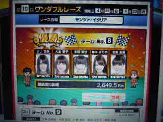 ワンダフルルーレット、今日の当たりは・・・佐藤夏希・・・。どうでもいいメンバーきちゃった。でもダブりじゃないし、まぁ仕方ないです今日もめげずにちょっとメンバー変えて8人にBETしました大者では、こじはるに賭けましたよ次は大者来るか、どうでもいい人続きか、私が賭けてる本命の中塚智実・前田亜美・小森美果が来そうな予感・・・
