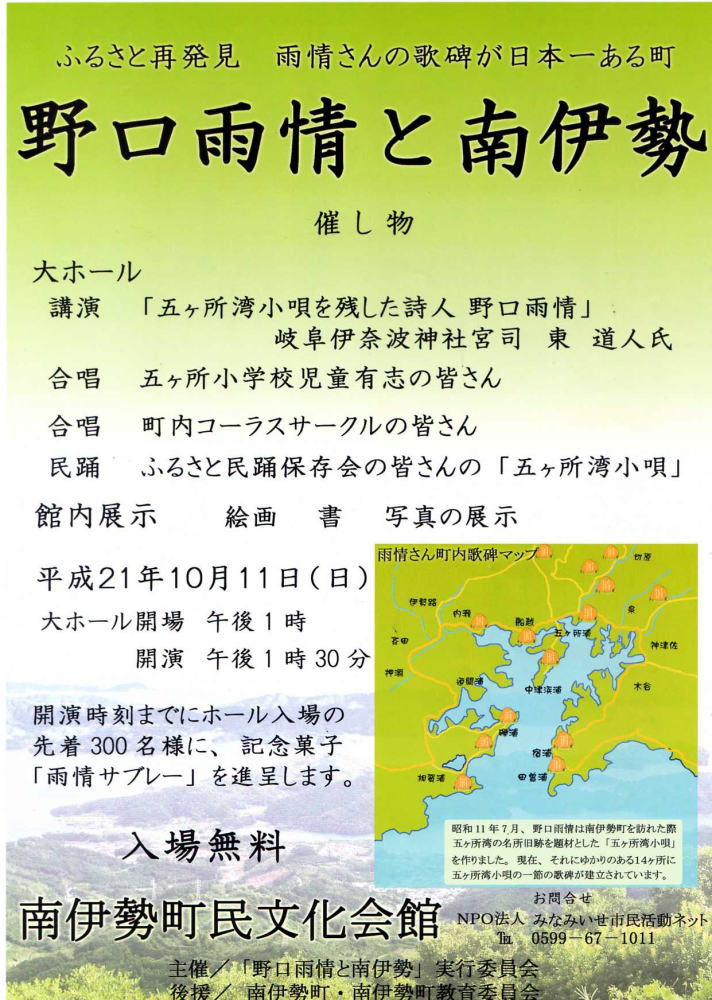 野口雨情をテーマにしたイベントがあるそうです。内容:野口雨情についての講演、合唱、民踊、絵画、書、写真の展示など日時:2009年10月11日(日)場所:三重県南伊勢町五ヶ所浦 町民文化会館