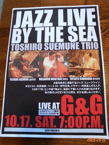 ジャズコンサート情報です。日時:2009年10月17日(土曜日) 午後7時から場所:三重県南伊勢町五ヶ所浦 喫茶店「グリーン&グリーン」出演:TOSHIRO SUEMUNE TRIO料金:500円(ドリンク代)