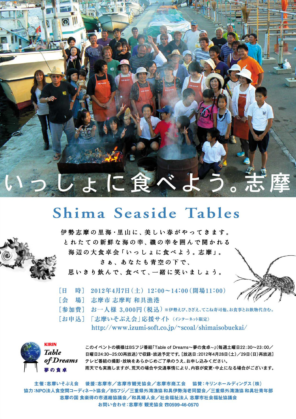 イベント情報です。日時:4月7日(土) 12:00~14:00場所:三重県志摩市志摩町 和具漁港内容:食事会「一緒に食べよう 志摩。」参加費:一人 3,000円(税込)(伊勢エビ、サザエ、てこね寿司他の食事代、飲料代含む)当日はテレビの取材があるそうです。放送日4月28日(土)だそうです。「早めにお申し込みください。」とのことです。詳細はこちらへお願いします。http://www.izumi-soft.co.jp/~scoal/shimaisobuekai/index.html