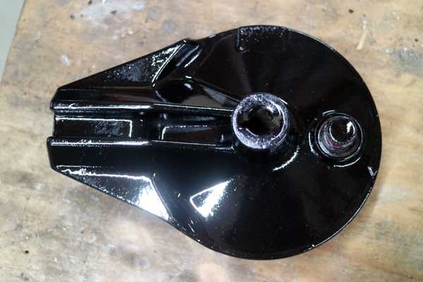 古いシューを外して、取り付け部にグリスを塗った新品シューをセットする。当然であるがサイズもピッタリだ。ホイールに組み付け時に、サビが酷かったチェーンアジャスターを塗装しておいたので忘れず組み付ける。