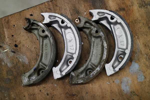 新品だと5ミリだが、3ミリになると要点検。2ミリになると要交換となるので、このシューは即交換である。ドラムや他の箇所は問題なかったので、効きが悪かったのはシューの摩耗が原因であろう。