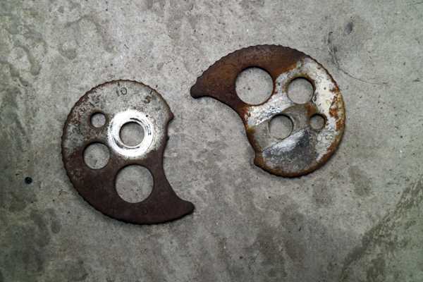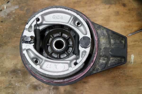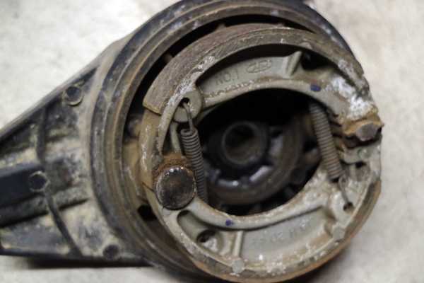 ホイールから外したリアブレーキパネル(摺動部がグリス切れでカラカラだ)
