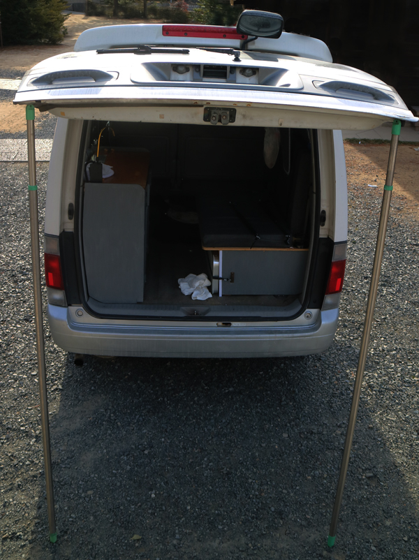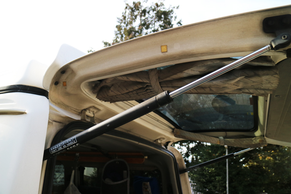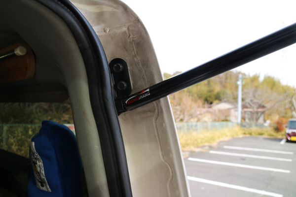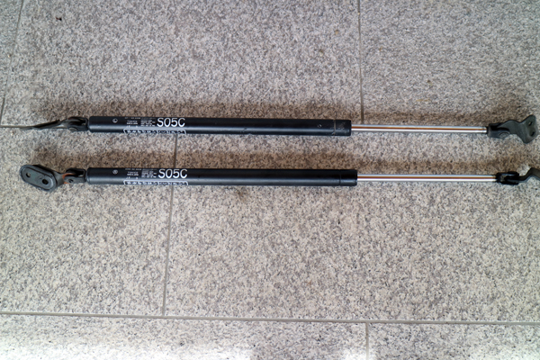 取り付けに際しては、必ずつっかえ棒をして両方同時に取り替える事と絶対にロッドを手で押し下げないようにとの事が注意書きに記してあったので、タープ用の物干し竿2本で支えて純正ダンパーを取り外す。右側から仮付けしてみると純正より僅かに長くボルトを締める事が出来ない。またやっちまったか!中華品質を信用したばかりに面倒な事になりそうな予感がした。ロッドを外してよく調べてみると両端がネジになっており少しだがアジャスターになっている事に気が付いたので、両方ともネジを一杯まで締めて全長を短くし、ドア側を仮止めして車体に取り付けるのだが、今度は角度が合わない。