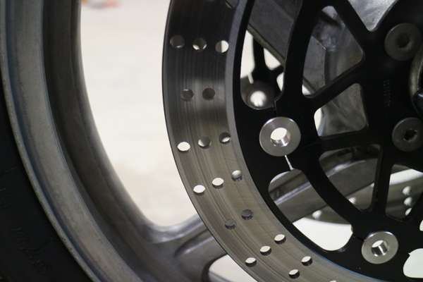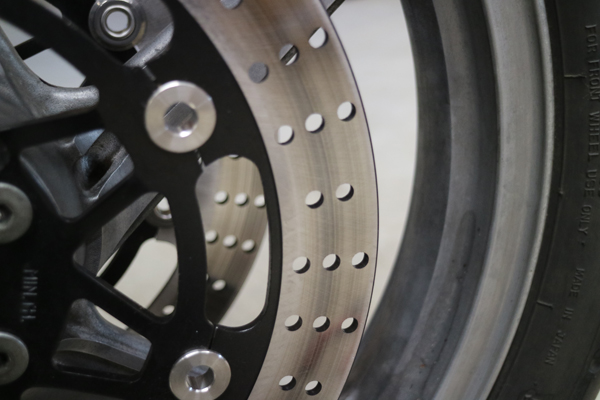 最近のバイクのようにガツンとは効かないが、必要にして十分な効き具合だ。ドンキーベースに帰って、ディスクの確認をすると、今まではパッドの当たり面が縞模様になっていたのだが、左側の内側が僅かにパッドの当たりが悪いが、劇的な改善が見られた。右側は内側から外側まで均等に当たっており、左右共縞模様が消えている。これが本来のディスク面である。