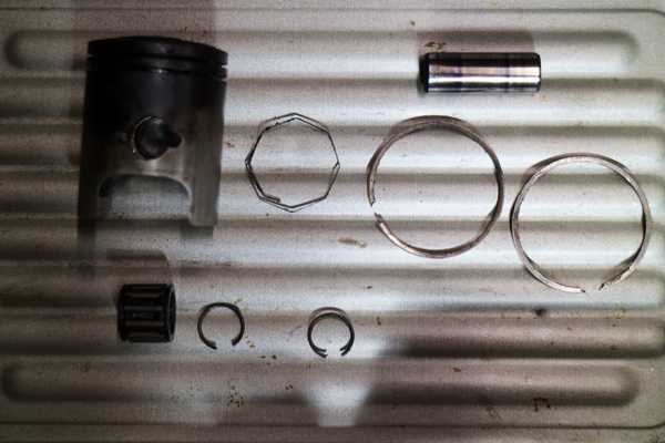 次はシリンダを抜いて行くのだがこれも力を掛ける間も無く直ぐに外れた。どうやらこのエンジンは一度開けられているようだ。シリンダからピストンを抜いてみると、汚い!混合ガスが吹き抜けたと思われる黒いカーボンがピストンの両脇に付着して黒ずんでおり、リング付近は真っ黒だ。やはり3号機の程度が一番悪い。