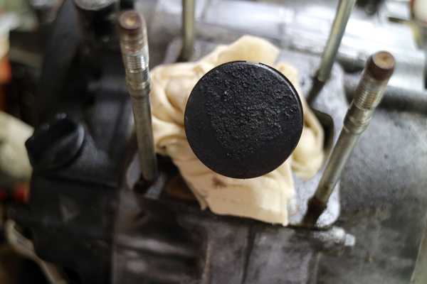 シリンダヘッドもすぐ外れピストンの頭とご対面。ヘッドの裏側のカーボンはさほどでも無いが、ピストンは黒いカーボンがかなり堆積している。やはり思った通り3号機の程度が一番悪い。