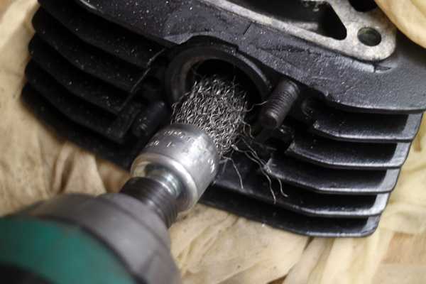 ワイヤブラシで研磨中の排気ポート