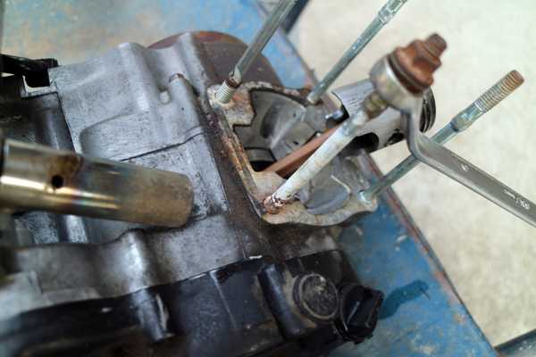 先ずはスタッドボルトの移植からである。電触で真っ白に錆びたボルトを抜くためダブルナットにメガネレンチを掛けて力を入れるも緩まない。渾身の力を掛けるとボルトが曲がったり、クランクケース内で折れる事も予想されるので、バーナーで炙ったら何とか緩んだ。