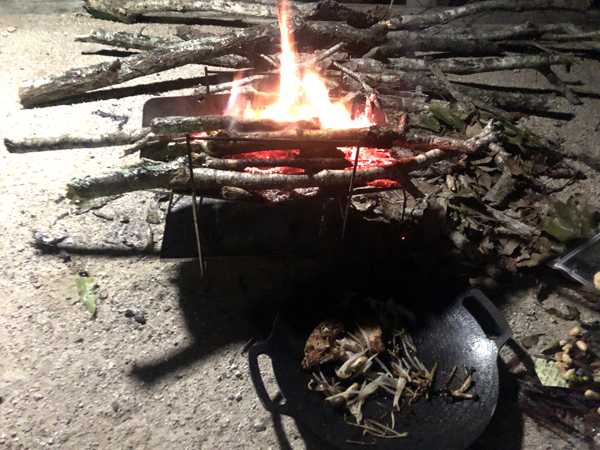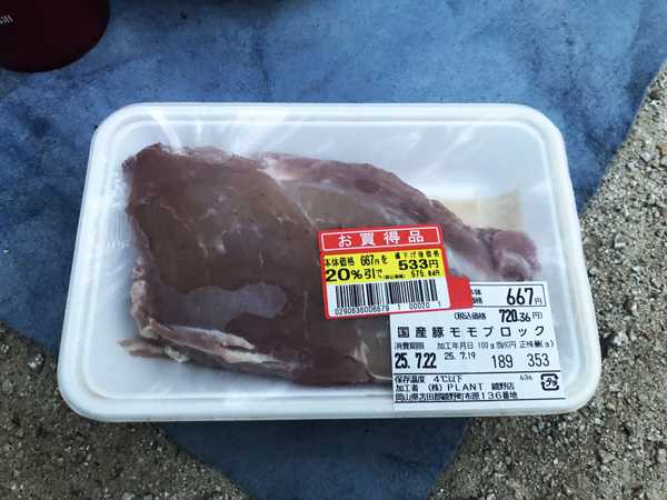 丁度良い具合に熾きになった焚き火台にマルチグリドルを掛け、クロスカブさんに頼んでおいた鶏のモモ肉をお願いすると、うやうやしく保冷剤入りの保冷袋から、大きなパック肉を2つ取り出した。昨日、津山のスーパーまで買いに行った一品だと胸を張るが、色が少し変である。手にとってよく見ると、20%引きのシールと共に国産豚モモブロックのシールが貼られていた。どう見てもブタ肉だ。それも油身が無いモモ肉だ。パックを持った手を震わせながら「あれほど念を押したのに何でブタ肉?」と問うと、「ありゃ。間違えてるわ。」と涼しい顔。こんな事もあろうかと思って、シッカリLINEの文章で鶏のモモ肉ですよ!と2度に渡り送り、返信の確認まで取っておいたのに…。しかも一抹の不安があったので、前日にLINEで「当日他の買い物をするので、鶏のモモ肉はこちらで用意しましょうか?」と送ったら、「大丈夫です。シッカリ用意出来ます。」との返信だったので、安心していたのだがこのザマだ。