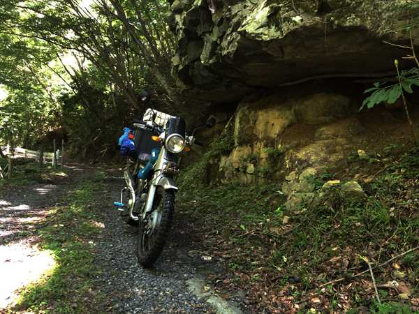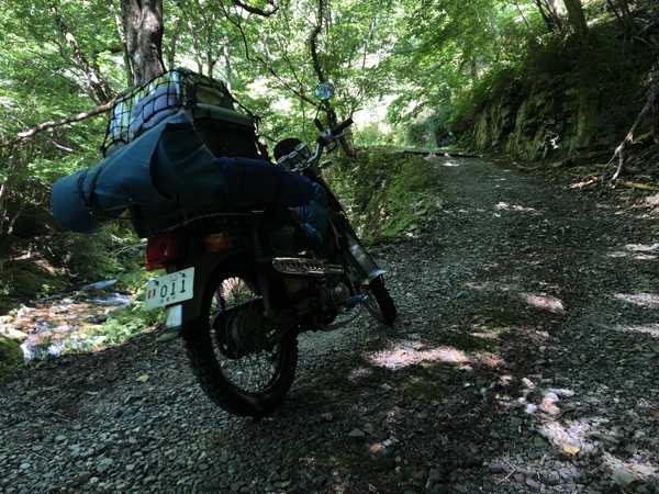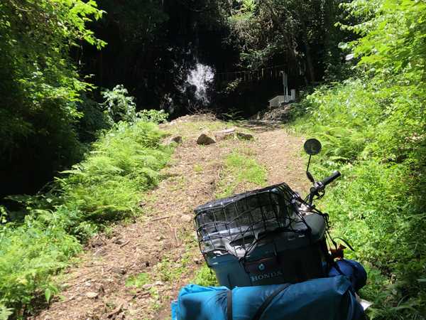 11時30分、クロスカブさんの事務所に到着。このまま滝へ行ってみる事となり、カブ2台で滝に向かう。昨年は途中の空き地にカブを駐めて汗をかきながら歩いて登ったのだが、クロスカブさんは今回はカブで滝壺まで登ろうと言う。前回の記憶では空き地から滝壺までは全て急勾配のオフロードなので、セローかTLR200なら行けそうだがカブではパワー不足だと思った事が思い出されたが、登り切れなかったらその時に考える事として挑戦に同意した。