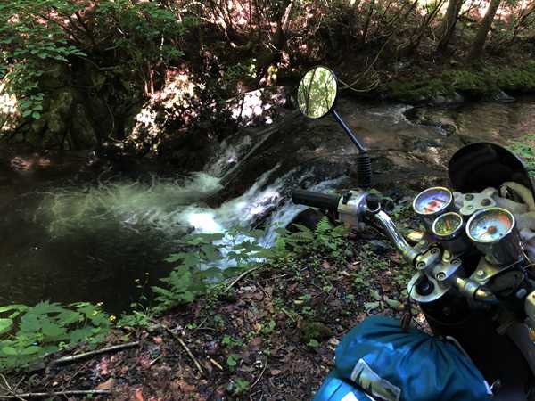 焼き付きを起こさないかとヒヤヒヤしていると、滝壺まで後数メートルという所でクロスカブが止まった。その瞬間車体諸ともクロスカブさんがずり落ちて来て大転倒。こんな事もあろうかと距離を取っていたので、共倒れする事は免れたが、この急勾配でストップすると、前後のブレーキを掛けてもタイヤがロックしてそのままクロスカブさん同様ずり落ちて転倒する事は目に見えているので、咄嗟にフロントタイヤを大きな石の間に入れて車体を支えてフルブレーキでバイクを止めた。ギアは1速に入れたままでエンジンを切って、クロスカブさんを助けに行こうとして、何故かハンドルからスマホを外して一大スクープを撮ろうとした薄情者の自分が情けない。