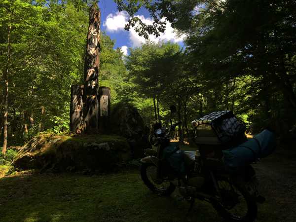 渓谷へ分け入る道はさらに奥へと続いており、入口に熊出没注意の看板が出ていたので、念のためにリアボックスから熊撃退スプレーを取り出し、腰のベルトにセットして進むと、アスファルトが途絶え予想通り荒れたオフロードになった。今回は電動空気入れは持って来ていないので、空気圧は落とさず、熊との遭遇も考慮して低速で前進する。渓谷を登って行くに従って沢や渕の名所が次々と現れ目を楽しませてくれる。秋には紅葉がさぞかし美しいであろう事が想像出来る。