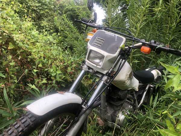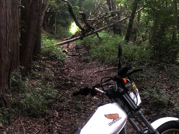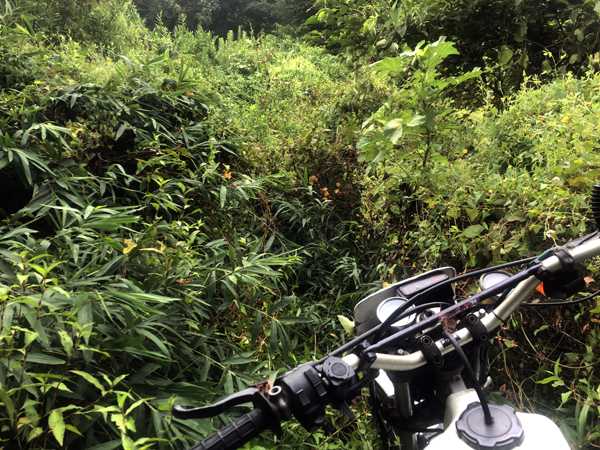 しかし、諦め切れないので、坂にバイクを止めて歩いて現場検分を行うと、杉の倒木の根元付近の斜面にタイヤの幅ほどの隙間があるのを見つけた。渾身の力で桜の枝を除けて、スタンディングのまま狙いを定めてフロントタイヤを隙間に入れてアクセル全開で何とかクリア。たぶん今日一の難所だろうと安堵したとたんに、今度は行く手を阻む背丈程もある雑草が続いていた。道は全く見えないので先がどうなっているのか分からないが構わず突っ込んだ。しかし、数メートル進んだところでエンスト。もうこれ以上は進めない。悔しいがここで断念。完敗である。幻の日吉神社を拝する事はおろか、境内に辿り着く事すらできなかったのである。恐るべし日吉神社。