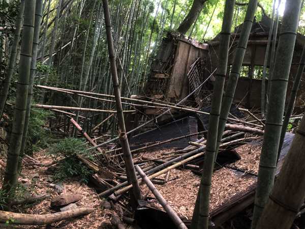 集落があった形跡を残す崩れた廃屋(左側が日吉神社へ続く参道)