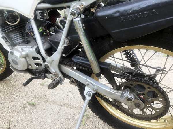 来た道を引き返し、下池の土手で休憩。凍らせたお茶を飲んで一息ついて、バイクに絡みついた蔓植物や細い枯れ枝を取り除いていると、とんでもない光景を目にした。まさか!何と左のリアサスのダンパーのネジが外れブランブラン。スプリングが欠落しているのだ。いくら激しいオフロードだったとは言え、こんな事が起こるものだろうか?正に目を疑うような光景だ。