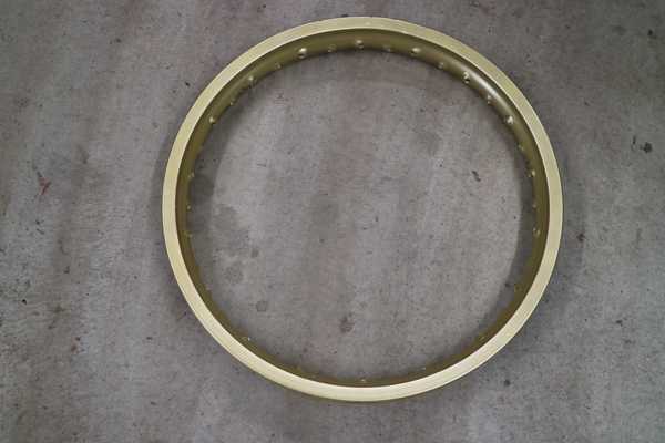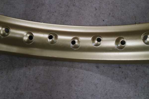 TYのアルミホイールはナイロンディスクで汚れを落とし、ゴールドで塗装後、クリアを吹いた。これで上手いこと組めたら、リアもフロントと同じ軽くて綺麗なホイールなるが果たしてどうだろう。