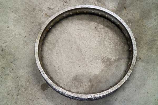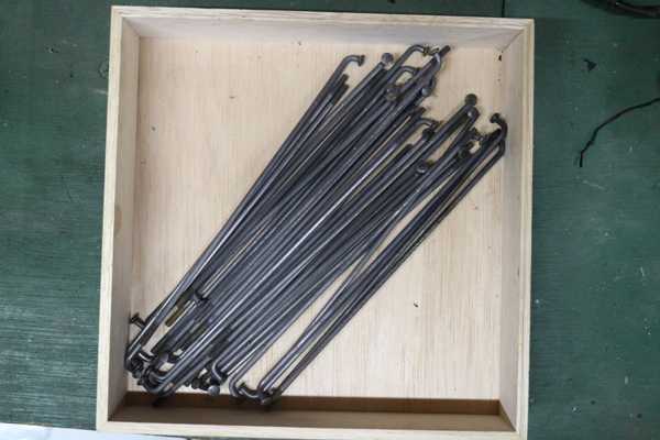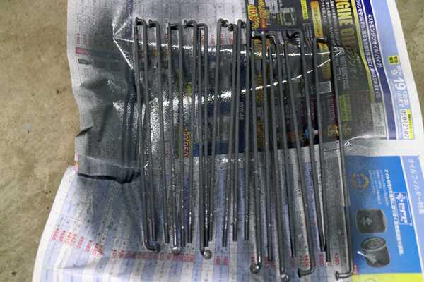 TY用のスポークは使えないが、他にも予備のスポークがストックしてあるので探してみたら、何とTLM50と同じサイズで2種類の首の角度のスポークが出て来た。何の車種の物かは記憶にないが、錆びも少なく使えそうである。本数を数えてみたら、31本。5本足らないので、鉄ホイールから程度の良さそう物を外す。