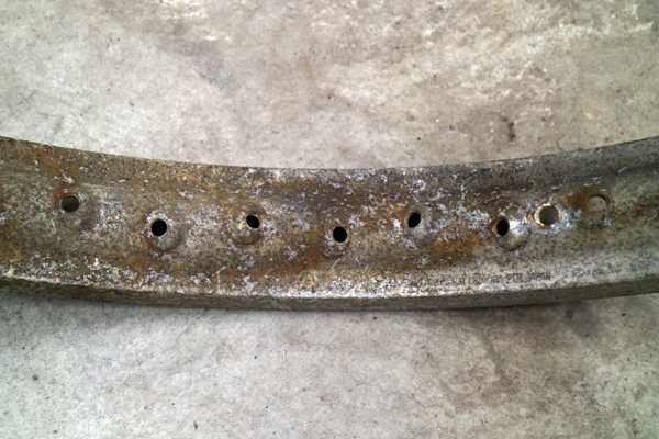 コンビネーションレンチでも無理なので、1本1本バーナーで炙ってみるが緩む気配がないので、更にニップルとスポークが真っ赤になるまで炙ったらやっと緩んだ。それでも手強いニップルが3箇所あり、これはネジの箇所から3本供折れてしまった。36本の内3本が欠損。その内アウターが2本、インナーが1本だ。