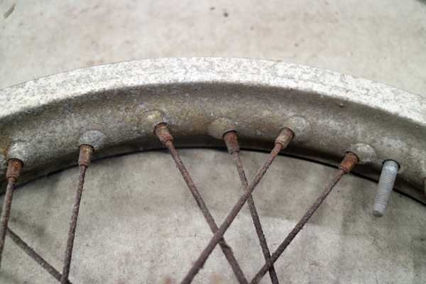 残るはスポークとニップルだ。TLMの鉄ホイールに付いているニップルを全て外す事が出来れば、スポークは錆落としの上、塗装して再使用、ニップルはTY125の物を使用すれば何とかなりそうである。