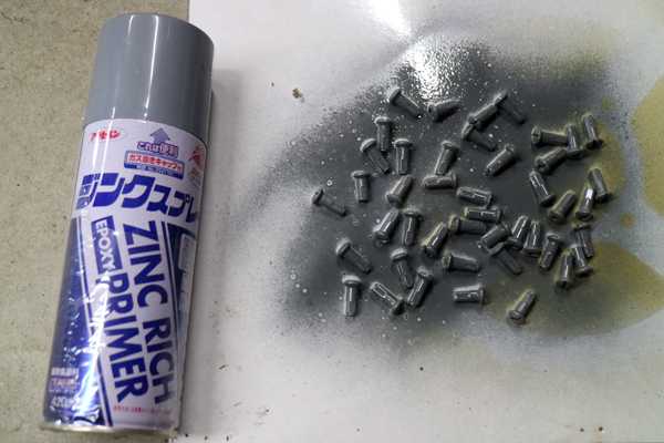 タンククリーナーは希釈して50°ほどにして浸けると効果があるが、湯を沸かすのが暑いので、常温で3日間ほど放置したら錆は綺麗に除去され、鉄色が甦った。タンククリーナーは防錆効果もあるので、このまま使用するか塗装するか迷ったが、亜鉛のジンクスプレーを吹く事にした。吹き終わって色目を見たら濃いグレーで今一つだったので、1号機のリアと同じく缶スプレーのシルバーを吹いた。