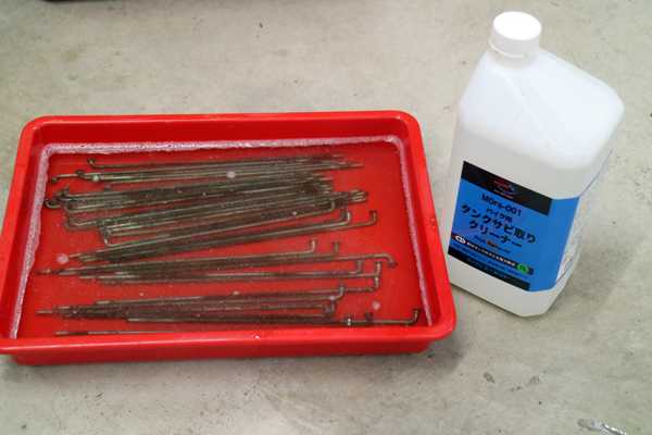 エーゼットのタンク錆取りクリーナーに浸けたスポーク