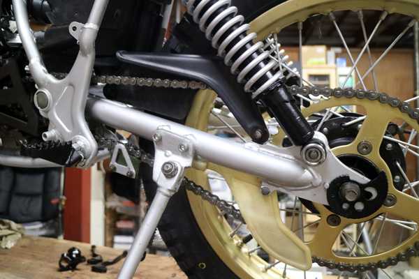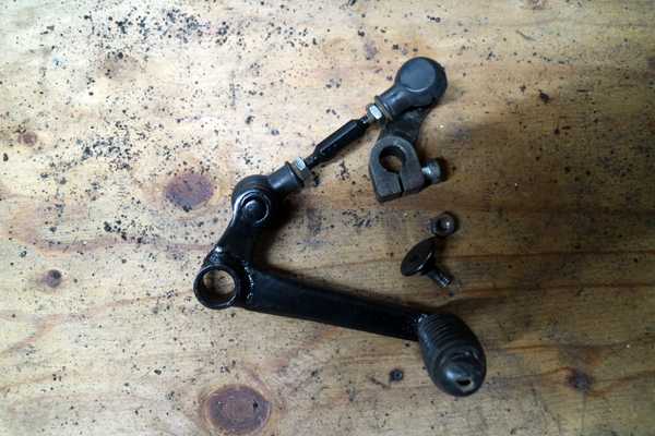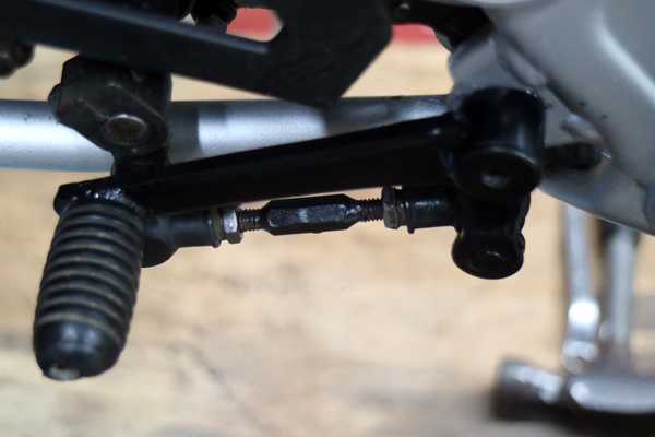 先ずはシフトリンクからだ。ロッドやピボット部に錆びが出ているので分解してグラインダーとサンドブラストで処理したが、ピボット部は砂が入るとマズイのでゴムの保護カバーの隙間からワイヤブラシで大まかに錆落としを行い、赤サビ転換剤を塗ってグリススプレーをたっぷりと吹いておいた。他の部品は赤サビ転換剤を塗りブラック塗装で完了。シフトペダルの角度を考えながら、シフトスピンドルにシフトリンクを取り付けて完了である。