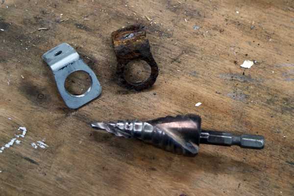 ステップドリルで穴開けを行い成形したステーと外したステー